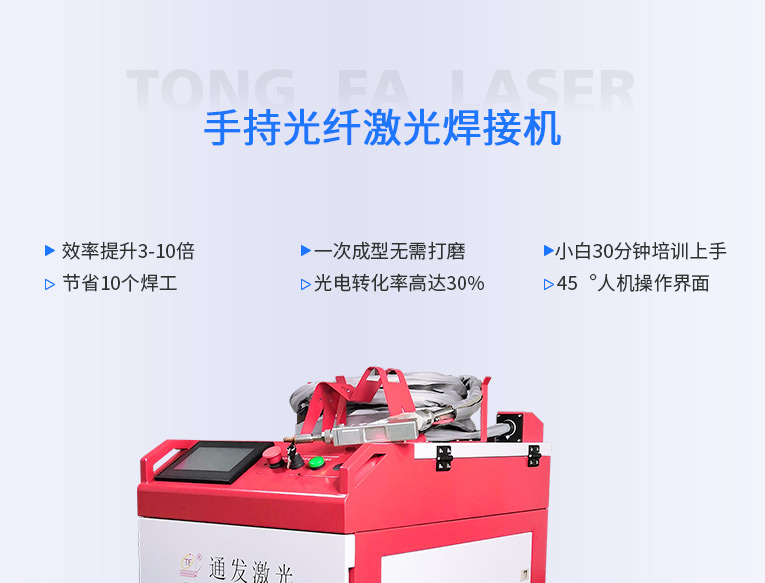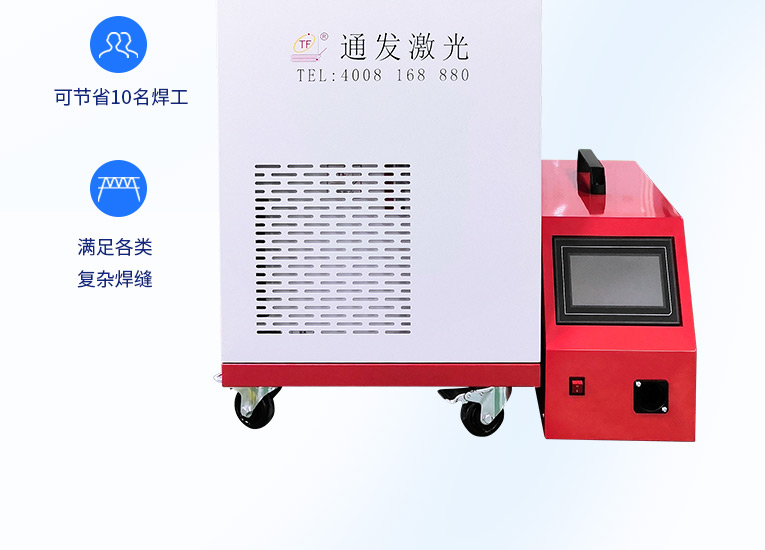 通發激光一體式手持式激光焊接機,用手持式焊接槍替代以前固定光路,手拿焊接,靈活方便,焊接距離更長,克服工作臺空間的局限性,工件尺寸不統一時無法自動焊接的情況下使用。主要針對大型工件、固定位置如內直角、外直角、平面焊縫焊接、焊接時熱影響區域小,變形小、而且焊接深度大,焊接牢固。是遠距離焊接大工件的較為靈活的全新的焊接工藝。