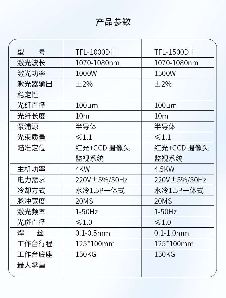 采用光纖激光器,反射率高,能量強,免維護,免調光,功耗少,相比傳統 模具焊來說,體積小,安全,穩定性好超長使用壽命。 1000W光纖激光器,滿足銅、鋁焊接量大的模具及產品焊接加工需要。 高承重底座及工作臺,保持輕便靈活的優點,同時提供更高承載能力。 配備.1.5P大功率一體式水冷水機,保證了大功率焊接的穩定性。